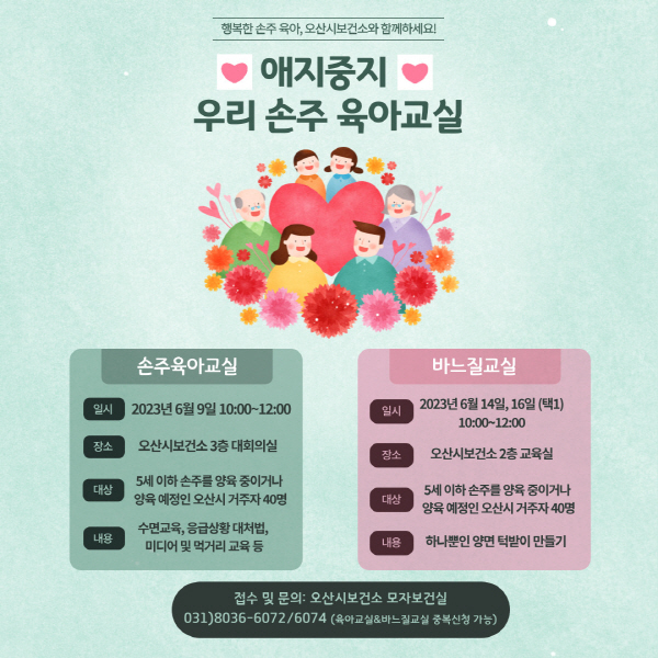 À°¾Æ±³½ÇÀº ¿À´Â 6¿ù 9ÀÏ, 14ÀÏ, 16ÀÏ ÃÑ 3ȸ ¹«·á·Î ÁøÇàµÇ¸ç, 5¼¼ ÀÌÇÏ ¼ÕÁÖ¸¦ ¾çÀ° ÁßÀ̰ųª ¾çÀ° ¿¹Á¤ÀÎ Á¶ºÎ¸ð¸¦ ´ë»óÀ¸·Î ÇÑ´Ù, ¸ðÁý ÀοøÀº ¼±Âø¼ø 40¸íÀ¸·Î ½Åû ¹®ÀÇ´Â ¿À»ê½Ãº¸°Ç¼Ò ¸ðÀÚº¸°Ç½Ç·Î ¿¬¶ôÇÏ¸é ¾È³»¹ÞÀ» ¼ö ÀÖ´Ù.