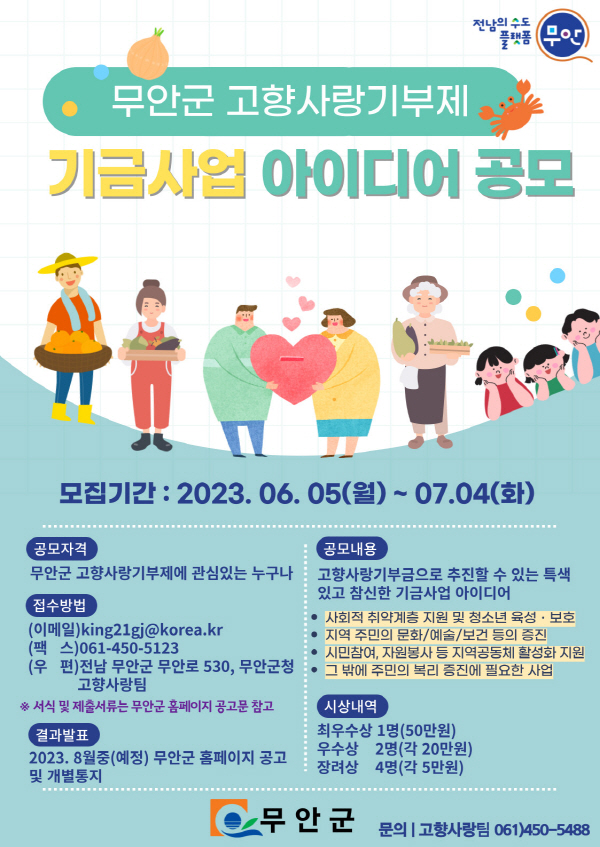 Àü³² ¹«¾È±ºÀÌ 6¿ù 5ÀϺÎÅÍ 7¿ù 4ÀϱîÁö Àü ±¹¹ÎÀ» ´ë»óÀ¸·Î °íÇâ»ç¶û±âºÎÁ¦ ±â±Ý»ç¾÷ ¾ÆÀ̵ð¾î °ø¸ðÀüÀ» ÁøÇàÇÑ´Ù°í 7ÀÏ ¹àÇû´Ù.