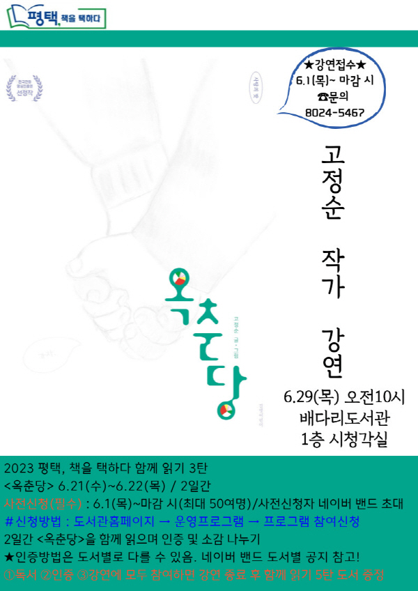 ÆòÅýô ½Ã¹Îµ¶¼¿îµ¿ 'ÆòÅÃ, Ã¥À» ÅÃÇÏ´Ù' 2023³â ¿ÃÇØÀÇ Ã¥ <¿ÁÃá´ç> °íÁ¤¼ø ÀÛ°¡ÀÇ °¿¬ÀÌ ¿À´Â 29ÀÏ ¿ÀÀü 10½Ã¿¡ ¹è´Ù¸®µµ¼°ü¿¡¼ ¿¸°´Ù°í 22ÀÏ ¹àÇû´Ù.