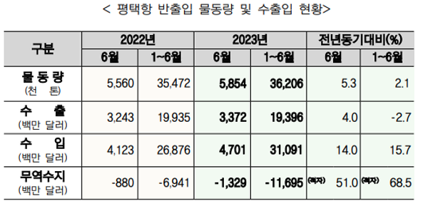 ÆòÅÃÁ÷ÇÒ¼¼°üÀº 2023³âµµ 6¿ù ÆòÅü¼°ü ¹ÝÃâÀÔ ¹°µ¿·® ¹× ¼öÃâÀÔ ÇöȲÀ» Áý°èÇÑ °á°ú, ¹°µ¿·®Àº Àü³â µ¿±â ´ëºñ 5.3% Áõ°¡ÇÑ 5,854õ ÅæÀ̸ç, ¼öÃâ¾×Àº 4.0%Áõ°¡ÇÑ 33.7¾ï ´Þ·¯, ¼öÀÔ¾×Àº 14.0% Áõ°¡ÇÑ 47.0¾ï ´Þ·¯, ¹«¿ª¼öÁö´Â ¾à 13.3¾ï ´Þ·¯ ÀûÀÚ¸¦ ±â·ÏÇß´Ù°í ¹àÇû´Ù.