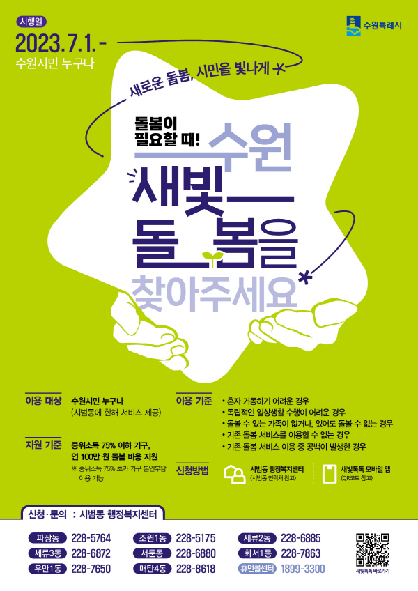 ¼ö¿ø½Ã°¡ Áö³ 7¿ù1ÀϺÎÅÍ ½ÃÀÛÇÑ ¼ö¿ø»õºûµ¹º½Àº ±âÁ¸ »çȸº¹Áö ½Ã½ºÅÛ¿¡¼ ¾î¿ ¼ö ¾øÀÌ ¹ß»ýÇÏ´Â µ¹º½ °ø¹éÀ» ¸Þ¿öÁØ´Ù. Àå¾ÖÀÎ, ³ëÀÎ, ¿µÀ¯¾Æ, ¾Æµ¿, û¼Ò³â, û³â, ÁßÀå³â±â µî µ¹º½ÀÌ ÇÊ¿äÇÑ »ç¶÷µéÀ» À§ÇÑ ±âÁ¸ ¼ºñ½ºµéÀº ÇàÁ¤ÀýÂ÷·Î ÀÎÇØ Àû°Ô´Â 2ÁÖºÎÅÍ ¸¹°Ô´Â 2°³¿ùÀÇ ½Ã°£ÀÌ °É¸°´Ù. ÀÌ ¶§ ¼ö¿ø»õºûµ¹º½ÀÌ ±âÁ¸ ¼ºñ½º ½Åû ÀÌÈÄ ´ë±â ±â°£¿¡ µ¹º½¼ºñ½º¸¦ Á¦°øÇØ ºÒÆíÀ» ÁÙÀδÙ. ½Åû 3ÀÏ À̳»¿¡ ÇöÀ广¹®À» ÁøÇàÇϰí, µ¹º½ÀÌ ÇÊ¿äÇÑ °æ¿ì¶ó°í ÆÇ´ÜµÇ¸é ºü¸£°Ô ¼ºñ½º¸¦ ¿¬°áÇØ ÁØ´Ù. ¼¼¼ö³ª ¾çÄ¡Áú, ¼¼Å¹°ú û¼Ò µî µ¶¸³ÀûÀÎ ÀÏ»ó»ýȰ ¼öÇà Á¤µµ¿Í Áúº´ ¹× Á¤½Å°Ç°°ú °í¸³ ¼öÁØÀ» Á÷Á¢ È®ÀÎÇϰí, µ¹º½À» Á¦°øÇÒ °¡Á·ÀÌ ÀÖ´ÂÁö, ±âÁ¸ µ¹º½¼ºñ½ºÀÇ °ø¹éÀÌ ¹ß»ýÇß´ÂÁö µî ½Ã±Þ¼ºÀ» Á¾ÇÕÀûÀ¸·Î ÆÇ´ÜÇÑ´Ù. ±ä±ÞÇÑ °æ¿ì Áï½Ã ¼ºñ½º¸¦ ¿¬°áÇÒ ¼öµµ ÀÖ¾î ´Ù¸¥ º¹Áö¼ºñ½ºº¸´Ù ºü¸£°Ô µ¹º½ °ø¹éÀ» ä¿öÁØ´Ù.