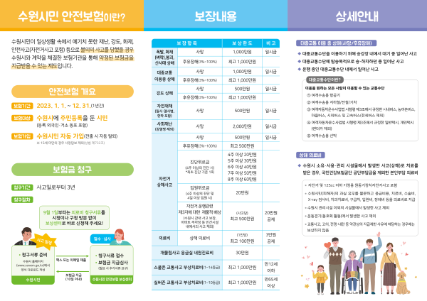 ¼ö¿ø½Ã¹Î ¾ÈÀüº¸ÇèÀº ¿¹±âÄ¡ ¸øÇÑ ÈÀç, ¾ÈÀü»ç°í µîÀ» ´çÇÑ ¼ö¿ø½Ã¹Î(µî·Ï ¿Ü±¹ÀΡ¤°Å¼Ò µ¿Æ÷ Æ÷ÇÔ)¿¡°Ô º¸Çè±ÝÀ» Áö±ÞÇÏ´Â °ÍÀÌ´Ù. ¼ö¿ø½Ã¹ÎÀº º°µµÀÇ º¸Çè °¡ÀÔ ÀýÂ÷ ¾øÀÌ º¸Çè¿¡ ÀÚµ¿ °¡ÀԵȴÙ. º¸Çè±ÝÀº »ç°í ¹ß»ýÀϺÎÅÍ 3³â À̳»¿¡ û±¸ÇØ¾ß ÇÑ´Ù.