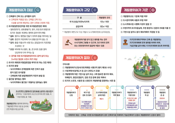 °³¹ßÇàÀ§Çã°¡Á¦µµ´Â ÅäÁö°³¹ß °èȹÀÇ ÀûÁ¤¼º, ±â¹Ý ½Ã¼³ÀÇ È®º¸ ¿©ºÎ, ÁÖº¯ °æ°ü ¹× ȯ°æ Á¶È­ µîÀ» °í·ÁÇØ ³­°³¹ßÀ» ¹æÁöÇϰí, ±¹ÅäÀÇ °èȹÀû °ü¸®¸¦ µµ¸ðÇÏ´Â µ¥ ¸ñÀûÀ» µÎ°í ÀÖ´Ù.