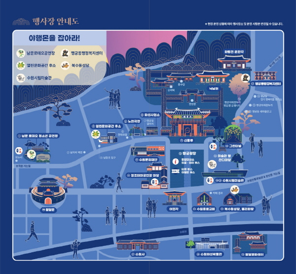 ¸ÕÀú ¹ã¿¡ ºñÃ纸´Â ¹®ÈÀç ¡®¾ß°æ(å¨ÌØ)¡¯Àº ¹®ÈÀç¿Í ¹®È½Ã¼³À» ¾ß°£¿¡ °ü¶÷ÇÏ´Â °ÍÀÌ´Ù. ȼºÇà±Ã(¿ÀÈÄ 9½Ã ÀÔÀå ¸¶°¨)°ú ¼ö¿ø½Ã¸³¹Ì¼ú°ü, ¼ö¿øÈ¼º¹Ú¹°°ü, ¿¸°¹®È°ø°£ ÈļÒ, Çà±Ã±æ°¶·¯¸®, ¼ö¿øÁ¾·Î±³È¸ ¿ª»ç°ü, ºÏ¼öµ¿¼º´ç »Ê¸®È¶û, ÇÑ¿Á±â¼úÀü½Ã°ü, ¼ö¿øÀüÅ빮Ȱü, ÆÈ´Þ¹®È¼¾ÅÍ µî ÀÏ´ë 9°³ ¹®È½Ã¼³ÀÌ ¹ã ´Ê°Ô±îÁö ¿¬Àå ¿î¿µµÈ´Ù.