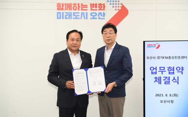 À̱ÇÀç ¿À»ê½ÃÀåÀº 8ÀÏ ½ÃÀå Áý¹«½Ç¿¡¼ °°æ½Ä °æ±âFTAÅë»óÁøÈï¼¾ÅÍÀå°ú ¡®±â¾÷ ±Û·Î¹ú ÁøÃâ Ȱ¼ºÈ¸¦ À§ÇÑ ¾÷¹«Çù¾à¡¯À» ¸Î°í À̰°ÀÌ ¹àÇû´Ù.