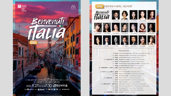 ¼­¿ï ¿µ»ê¾ÆÆ®È¦¿¡¼­ Ãß¼® ¿¬ÈÞ Àü³¯ÀÎ 9¿ù 27ÀÏ(¼ö) Àú³á 7½Ã 30ºÐ °³¸·ÇÏ´Â Á¦71ȸ ÀÌÅ»¸®¾Æ¼º¾Çȸ Á¤±â¿¬ÁÖȸ ¡®Benvenuti Italia¡¯´Â '¾î¼­ ¿Í! ÀÌÅ»¸®¾Æ ¿ÀÆä¶ó´Â óÀ½ÀÌÁö?'¶ó´Â Ä£ÀýÇÑ È¯¿µ ÀÎ»ç ¾Æ·¡, W. A. Mozart, G. Donizetti, V. Bellini, G. Verdi, G. Puccini, P. Mascagni, F. CileaÀÇ ÀÌÅ»¸®¾Æ ¿ÀÆä¶ó ÀÛǰ Áß »ç¶û¿¡ ´ëÇÑ °­·ÄÇÑ ¿­Á¤°ú ºñ¾Ö¸¦ ´ãÀº È­·ÁÇÑ ¾Æ¸®¾Æ¿Í µà¿§, ÁßâÀ» ¼±º¸ÀÏ ¿¹Á¤ÀÌ´Ù.