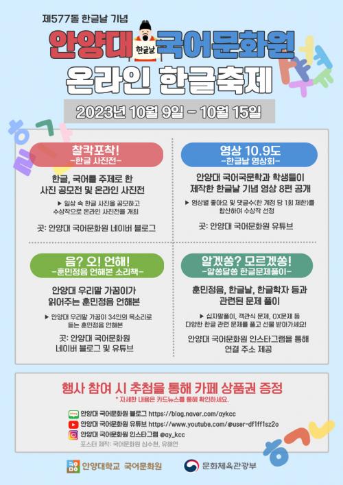 ¾È¾ç´ëÇб³(ÃÑÀå ¹Ú³ëÁØ) ±¹¾î¹®È¿øÀÌ Á¦577µ¹ Çѱ۳¯À» ¸Â¾Æ ¡®¿Â¶óÀÎ ÇÑ±Û ÃàÁ¦¡¯¸¦ °³ÃÖÇÑ´Ù°í 6ÀÏ ¹àÇû´Ù.