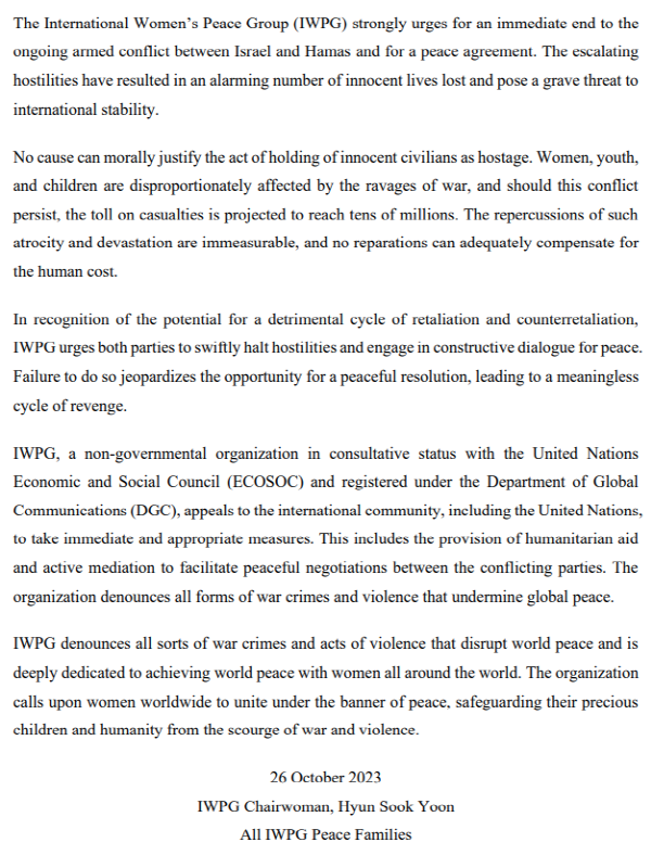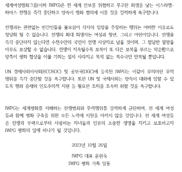 IWPG´Â 26ÀÏ ¡®À̽º¶ó¿¤-Çϸ¶½º ÀüÀï¿¡ °üÇÑ IWPG ¼º¸í¡¯À̶ó´Â Á¦¸ñÀÇ ¼º¸íÀ» ³»°í ¡°Àü ¼¼°è ¾Èº¸¸¦ À§ÇùÇÏ°í ¹«°íÇÑ Èñ»ýÀ» ³º´Â À̽º¶ó¿¤-Çϸ¶½º ÀüÀïÀ» Áï°¢ Áß´ÜÇÏ°í ¾çÃøÀÌ ÆòÈ ÇùÀÇ¿¡ À̸£·¯¾ß ÇÑ´Ù¡±°í ¿ä±¸Çß´Ù.