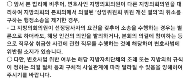 ´Ù¸¸ ¡°Áö¹æÀÇȸ°¡ Á÷¹«±ÇÇÑÀÇ ºÎ¿© ¶Ç´Â ¹ÚÅ»¿¡ ´ëÇÑ Àǻ縦 Á÷Á¢ °áÁ¤ÇÏ°í °øÇ¥ÇÏ´Â °æ¿ì¿¡´Â ÀÌ¿¡ °üÇÏ¿© ¹ý·ü»ó ÀÌÀÍÀ» °®´Â ÀÚ´Â Áö¹æÀÇȸ¸¦ Çǰí·Î ÇÏ¿© ÇàÁ¤¼Ò¼ÛÀ» Á¦±âÇÒ ¼ö ÀÖ´Ù¡±¸é¼­µµ ¡°¾Õ¼­ º» ¹ý¸®¿¡ ºñÃß¾î,....(Áß·«) ÇØ´ç ¾È°ÇÀÇ ÀǾÈÀ» ¹ßÀÇÇϰųª, º»È¸ÀÇ Àǰῡ Âü¿©ÇÏ´Â µîÀ¸·Î Á÷¹«»ó Ãë±ÞÇÑ »ç°Ç¿¡ °üÇÑ Á÷¹«¸¦ ¼öÇàÇÏ´Â °Í¿¡ ÇØ´çÇÏ¿© º¯È£»ç¹ý¿¡ À§¹ÝµÉ ¼ÒÁö°¡ ÀÖ´Ù.¡±°í Àû½ÃÇß´Ù.