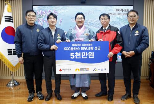 Ãæ³² ¾Æ»ê½Ã ¼ÒÀç (ÁÖ)KCC±Û¶ó½º(´ëÇ¥ÀÌ»ç ȸÀå Á¤¸ùÀÍ) ¾Æ»ê°øÀå(°øÀåÀå ¹Ú¿ø)Àº 2024³â 1¿ù 3ÀÏ(¼ö) ¾Æ»ê½Ã(½ÃÀå ¹Ú°æ±Í)¸¦ ¹æ¹®ÇÏ¿© ¡¸Èñ¸Á2024³ª´®Ä·ÆäÀΡ¹ÀÌ¿ô»ç¶û ¼º±Ý 5,000¸¸¿øÀ» Àü´ÞÇß´Ù.