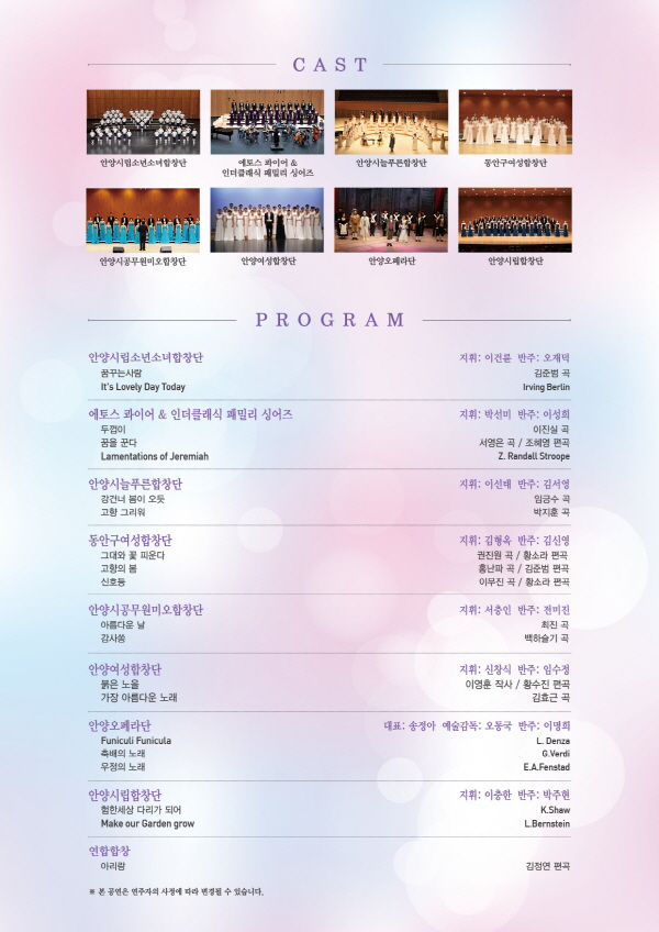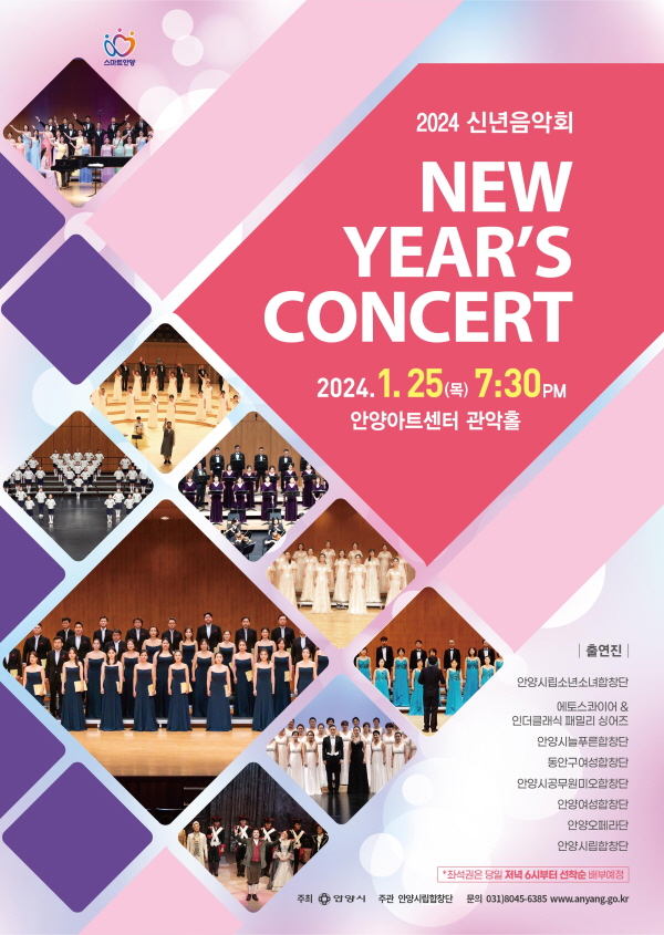 À̹ø 2024 ½Å³â À½¾Çȸ¿¡´Â ¾È¾ç¿ÀÆä¶ó´Ü°ú ¾È¾ç½Ã¸³ÇÕâ´ÜÀ» Æ÷ÇÔÇØ ¾È¾ç½Ã¸³¼Ò³â¼Ò³àÇÕâ´Ü, ¿¡ÄÚ½ºÄâÀ̾î&ÀÎÅÍŬ·¡½Ä ÆÐ¹Ð¸® ½Ì¾îÁî, ¾È¾ç½Ã´ÃǪ¸¥ÇÕâ´Ü, µ¿¾È±¸¿©¼ºÇÕâ´Ü, ¾È¾ç½Ã°ø¹«¿ø¹Ì¿ÀÇÕâ´Ü, ¾È¾ç¿©¼ºÇÕâ´Ü µî 8°³ À½¾Ç ¿¹¼ú´Üü°¡ Âü¿©ÇØ ¾Æ¸§´ä°í ¿õÀåÇÑ À½¾ÇÀÇ Ç⿬À» ÆîÄ£´Ù.