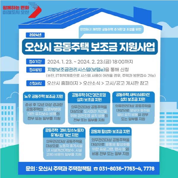 ¿À»ê½Ã, ¡®2024³â °øµ¿ÁÖÅà º¸Á¶±Ý Áö¿ø»ç¾÷¡¯ 23ÀϱîÁö Á¢¼ö ¹Þ¾Æ