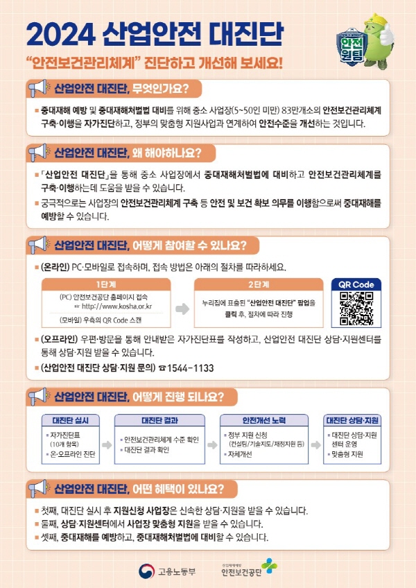 Âü¿©¸¦ ¿øÇÏ´Â »ç¾÷ÁÖ´Â Çѱ¹»ê¾÷¾ÈÀüº¸°Ç°ø´Ü ȨÆäÀÌÁö(www.kosha.or.kr)¿¡ Á¢¼ÓÇØ ¡®»ê¾÷¾ÈÀü ´ëÁø´Ü¡¯ ÆË¾÷âÀ» Ŭ¸¯Çϰųª È«º¸¹°¿¡ »ðÀÔµÈ QRÄڵ带 ½ºÄµÇØ ¸ð¹ÙÀÏ·Î Âü¿©ÇÒ ¼ö ÀÖ´Ù. »ê¾÷¾ÈÀü ´ëÁø´Ü »ó´ã¡¤Áö¿ø¼¾ÅÍ(1544-1133)¸¦ ¹æ¹®Çϰųª ¿ìÆíÀ¸·Î ÀÚ°¡Áø´ÜÇ¥¸¦ ¹Þ¾Æ Âü¿©ÇÏ´Â ¹æ¹ýµµ ÀÖ´Ù.
