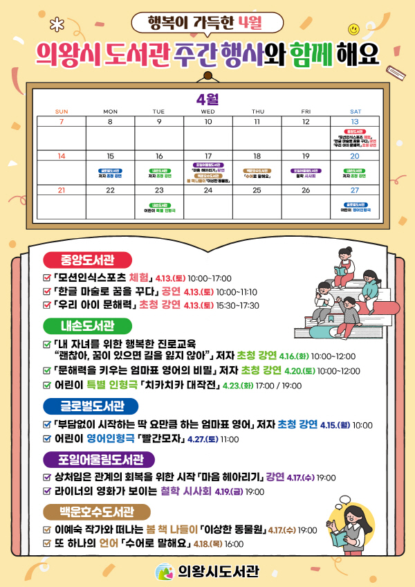 Àǿսô µµ¼°ü ÁÖ°£À» ¸Â¾Æ 4¿ù 12ÀϺÎÅÍ 18ÀϱîÁö ½Ã¹ÎµéÀ» À§ÇÑ ´Ùä·Î¿î º½¸ÂÀÌ µ¶¼¹®ÈÇÁ·Î±×·¥À» ¿î¿µÇÑ´Ù°í 21ÀÏ ¹àÇû´Ù.