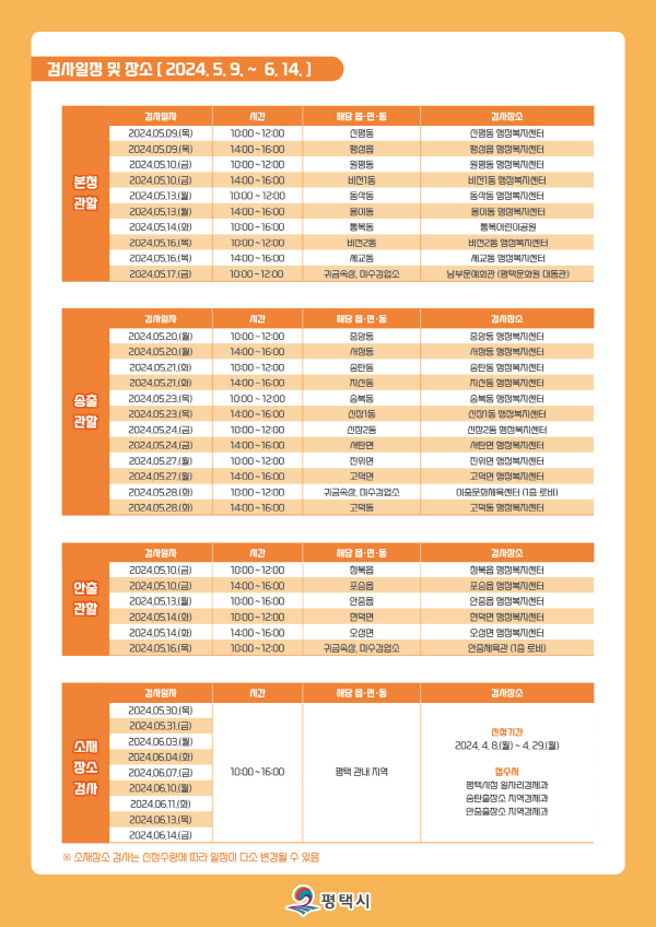À¾¸éµ¿ ¼øÈ¸°Ë»ç´Â À¾¸éµ¿ ÇàÁ¤º¹Áö¼¾ÅÍ¿¡¼ ³¯Â¥º°·Î 5¿ù 28ÀϱîÁö ÁøÇàµÈ´Ù. ¶ÇÇÑ °è·®¿¡ »ç¿ëÇÏ´Â Àú¿ïÀÌ ÅäÁö‧°Ç¹° µî¿¡ ºÎÂøµÅ À̵¿ÀÌ ¾î·Á¿î °æ¿ì µîÀ» À§ÇÑ ¼ÒÀç Àå¼Ò °Ë»ç´Â ½ÅûÀÚ¿¡ ÇÑÇØ 5¿ù 30ÀϺÎÅÍ 6¿ù 14ÀϱîÁö 9Àϰ£ ½Ç½ÃµÈ´Ù.