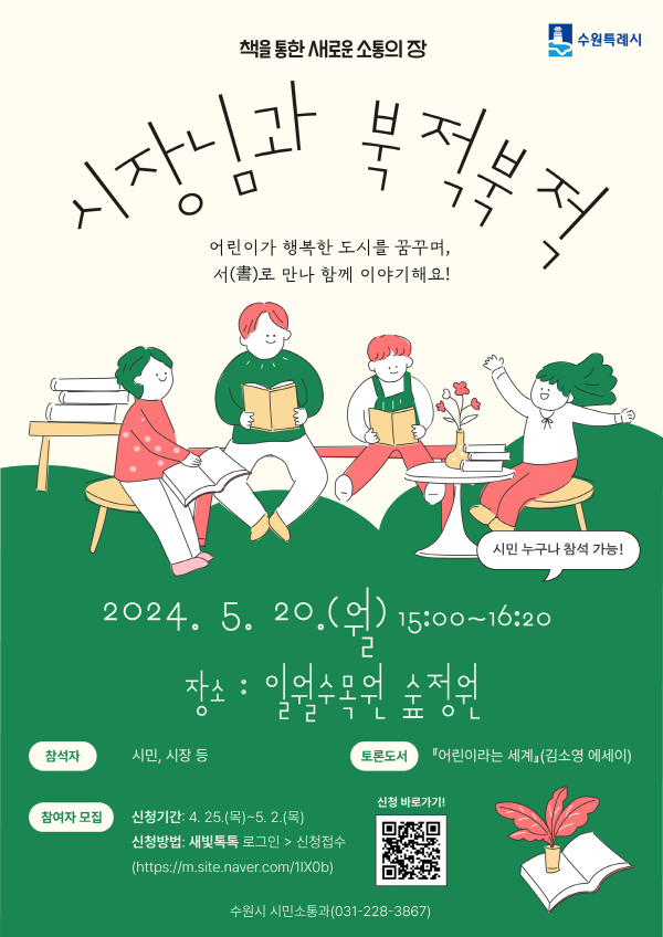 ÀÌÀçÁØ ¼ö¿ø½ÃÀå°ú ½Ã¹ÎµéÀÌ Ã¥ ¡¸¾î¸°À̶ó´Â ¼¼°è¡¹¸¦ Àаí, Ã¥ ³»¿ëÀ» ¹ÙÅÁÀ¸·Î ÀÚÀ¯·Ó°Ô Åä·ÐÇÏ´Â ¡®½ÃÀå´Ô°ú ºÏÀûºÏÀû¡¯ÀÌ 5¿ù 20ÀÏ ¿ÀÈÄ 3½Ã ÀÏ¿ù¼ö¸ñ¿ø ½£Á¤¿ø¿¡¼ ¿¸°´Ù.