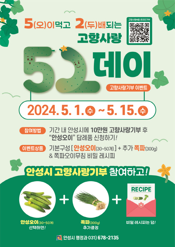¾È¼º½Ã(½ÃÀå ±èº¸¶ó)°¡ ¿ÀÀ̵¥ÀÌ(5.2.)¸¦ ¸ÂÀÌÇÏ¿© ¿À(5)ÀÌ¸Ô°í µÎ¹è(2)µÇ´Â °íÇâ»ç¶û À̺¥Æ®¸¦ 5¿ù 1ÀϺÎÅÍ 2ÁÖ°£ ÃßÁøÇÑ´Ù°í ¹àÇû´Ù.