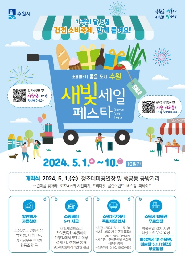 ¡®°¡Á¤ÀÇ ´Þ, 5¿ùÀÇ Ãູ¡¯À» ½½·Î°ÇÀ¸·Î ³»°Ç Á¦3ȸ »õºû¼¼ÀÏÆä½ºÅ¸´Â 10ÀϱîÁö ¿­Èê µ¿¾È ¿­¸°´Ù. ¼Ò»ó°øÀÎ, ÀüÅë½ÃÀå, ¹éÈ­Á¡, ´ëÇü¸¶Æ®, °æ±â³²ºÎ¼öÆÛ¸¶ÄÏÁ¶ÇÕ, ¼ö¿ø·ÎÄÃǪµåÁ÷¸ÅÀå µîÀÌ Âü¿©ÇØ ¼¼ÀÏ¡¤»çÀºÇà»ç¸¦ ¿¬´Ù. °³¸·Çà»ç´Â 1ÀÏ ¿ÀÈÄ 2½ÃºÎÅÍ 6½Ã±îÁö Çà±Ãµ¿ °ø¹æ °Å¸®¿¡¼­ ¿­¸°´Ù.