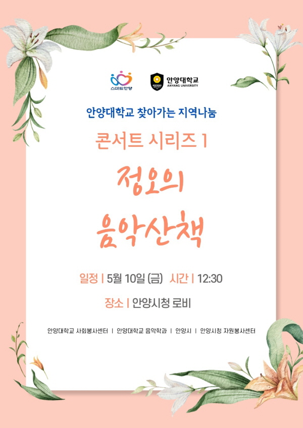 ¾È¾ç½Ãû¼­ 10ÀÏ ³· 12½Ã 30ºÐ ¿­¸®´Â ¡®Á¤¿ÀÀÇ À½¾Ç»êÃ¥¡¯Àº Áö¿ª°ú ÇÔ²²ÇÏ´Â ´ëÇÐ, ¾È¾ç´ëÇб³ÀÇ À½¾ÇÇаú¿Í »çȸºÀ»ç¼¾ÅÍ, ÀÚ¿øºÀ»ç¼¾ÅͰ¡ ÇÔ²² ÁغñÇÑ ¡®Ã£¾Æ°¡´Â Áö¿ª³ª´®¡¯ Äܼ­Æ® Çà»çÀÌ´Ù.