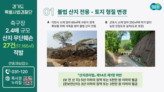 °æ±âµµ Ưº°»ç¹ý°æÂû´ÜÀº Áö³­ 4¿ù 15ÀϺÎÅÍ 5¿ù 3ÀϱîÁö ÈѼÕÀÌ ÀǽɵǴ µµ³» »êÁö 187ÇÊÁö¸¦ ÇöÀå ´Ü¼ÓÇØ »êÁö°ü¸®¹ý À§¹ÝÇàÀ§ 27°ÇÀ» Àû¹ßÇß´Ù.