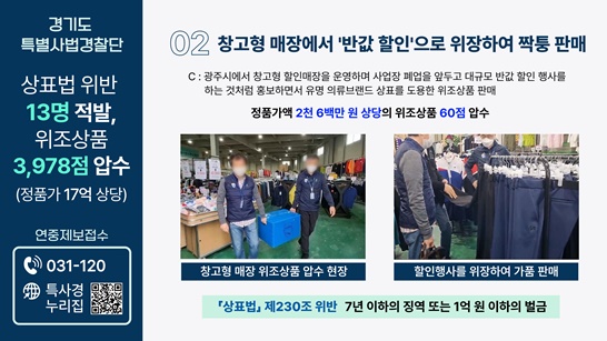 ¾çÁֽÿ¡ À§Ä¡ÇÑ »ç¾÷ÀåµéÀº(¼ö¼±Áý, ÀÇ·ù¸ÅÀå, ¾Æµ¿º¹¸ÅÀå µî) ÀÏ¹Ý ¿©¼º º¸¼¼¿Ê, ¾Æµ¿º¹, ¾×¼¼¼¸® µîÀ» ÆÇ¸ÅÇϸé¼, À¯¸í»óÇ¥¸¦ ¸ð¹æÇÑ À§Á¶»óǰ(ÀÇ·ù, ¸ðÀÚ, ¾×¼¼¼¸®, Çâ¼ö µî)À» ÆÇ¸ÅÇÏ´Â µî »óÇ¥¹ýÀ» À§¹ÝÇØ Á¤Ç°°¡¾× 1¾ï 6õ¸¸ ¿ø »ó´çÀÇ À§Á¶»óǰ 337Á¡À» ¾Ð¼öÇß´Ù.