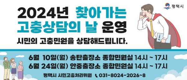 ÆòÅýà ½Ã¹Î°íÃæÃ³¸®À§¿ø½ÇÀº ¿À´Â 10ÀÏ(¼ÛźÃâÀå¼Ò Á¾Çչοø½Ç)°ú 24ÀÏ(¾ÈÁßÃâÀå¼Ò Á¾Çչοø½Ç)¿¡ 14½ÃºÎÅÍ 17½Ã±îÁö ¡®Ã£¾Æ°¡´Â °íÃæ»ó´ãÀÇ ³¯¡¯À» ¿î¿µÇÑ´Ù°í ¹àÇû´Ù.