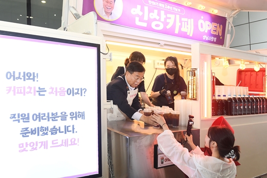 À̳¯ Ä¿ÇÇÂ÷ »çÀåÀ¸·Î º¯½ÅÇÑ ½Å»óÁø ¼º³²½ÃÀåÀº Á÷¿ø ÇѸí ÇѸí°ú ÀλçÇϸç, °¨»ç¿Í ÀÀ¿øÀÇ ¸Þ½ÃÁö¸¦ ÀüÇß´Ù.