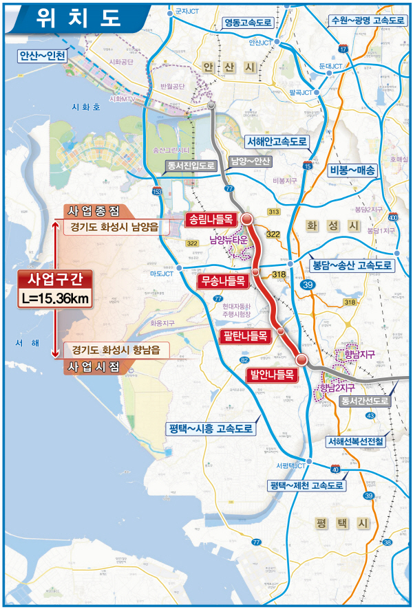¹ß¾È~³²¾ç °í¼ÓÈ­µµ·Î´Â È­¼º½Ã ³²ºÏÃà °£¼±µµ·Î¸Á º¸¿Ï°ú ³»ºÎ¼øÈ¯µµ·Î¸Á ±¸ÃàÀ» À§ÇÑ ³ë¼± Áß Çϳª·Î, È­¼º½Ã Çâ³²À¾ »ó½Å¸®¿¡¼­ ³²¾çÀ¾ ¼Û¸²¸®¸¦ ¿¬°áÇÏ´Â ÃÑ»ç¾÷ºñ 4,463¾ï ¿ø, ÃÑ ±æÀÌ 15.36km ±Ô¸ðÀÇ ¿Õº¹ 4Â÷¼± ÀÚµ¿Â÷ Àü¿ëµµ·ÎÀÌ´Ù.