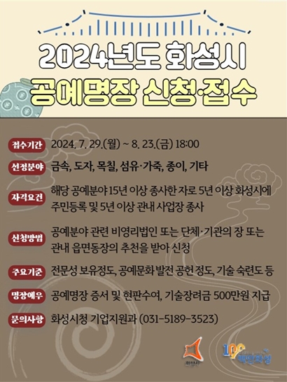 È­¼º½Ã(½ÃÀå Á¤¸í±Ù)°¡ ´ÙÀ½´Þ 12ÀϺÎÅÍ 23ÀϱîÁö ÀüÅë °ø¿¹±â¼úÀÇ °è½Â°ú ¹ßÀüÀ» À§ÇÑ ¡®2024³âµµ È­¼º½Ã °ø¿¹¸íÀ塯À» ¸ðÁýÇÑ´Ù.