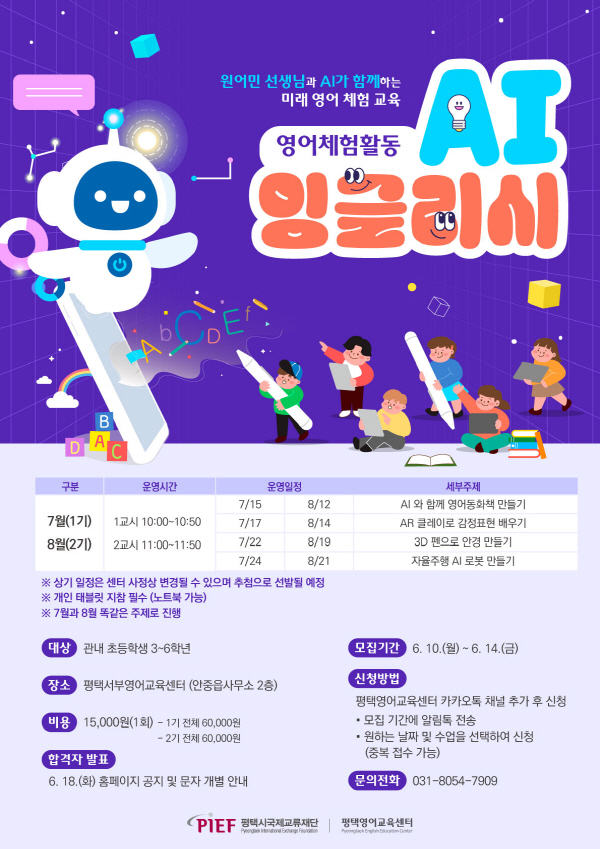 ÆòÅýñ¹Á¦±³·ùÀç´Ü¿¡¼ ¿À´Â 12ÀϺÎÅÍ 20ÀϱîÁö ÀΰøÁö´É(AI) ¿µ¾î ±³À° ÇÁ·Î±×·¥ ¡®AI À×±Û¸®½Ã¡¯¸¦ ÁøÇàÇÒ ¿¹Á¤À̶ó°í ¹àÇû´Ù.