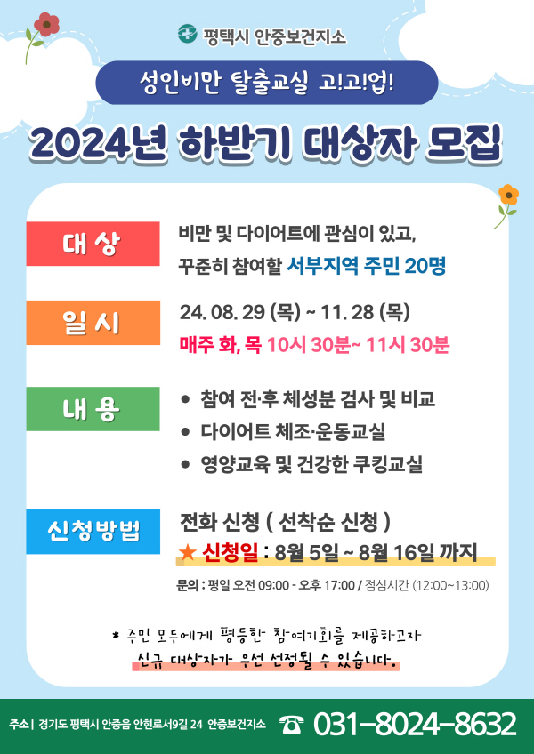 ÇöÀç ºñ¸¸ ¹× ´ÙÀÌ¾îÆ®¿¡ °ü½É ÀÖ´Â ¼ºÎÁö¿ª ÁÖ¹ÎÀ» ´ë»óÀ¸·Î ¼±Âø¼ø 20¸í ¸ðÁýÇϰí ÀÖÀ¸¸ç, Âü¿©¸¦ ¿øÇÏ´Â ÁÖ¹ÎÀº ¾ÈÁߺ¸°ÇÁö¼Ò °Ç°ÁõÁøÆÀ(031-8024-8632)À¸·Î ½ÅûÇÏ¸é µÈ´Ù.
