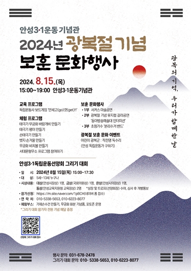 ¾È¼º½Ã(½ÃÀå ±èº¸¶ó) 3¡¤1¿îµ¿±â³ä°üÀº ¿À´Â 8¿ù 15ÀÏ ¡®2024³â ±¤º¹Àý ±â³ä º¸ÈÆ ¹®ÈÇà»ç¡¯¸¦ °³ÃÖÇÑ´Ù.