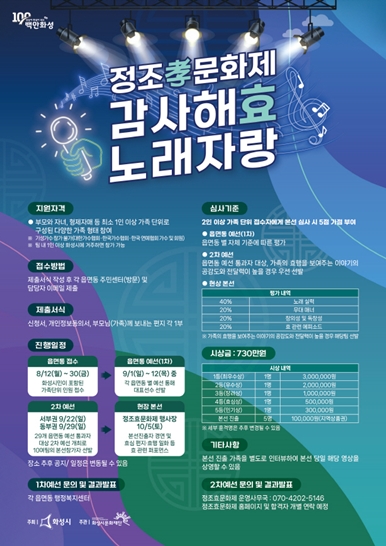 ¡¯°¨»çÇØÈ¿ ³ë·¡ÀÚ¶û¡® Á¢¼ö´Â ¿À´Â 8¿ù 12ÀÏ(¿ù)ºÎÅÍ 30ÀÏ(±Ý) ±îÁö °¢ À¾,¸é,µ¿ ÇàÁ¤º¹Áö¼¾ÅÍ¿¡¼­ ½Åû °¡´ÉÇÏ¸ç º¸´Ù ÀÚ¼¼ÇÑ ³»¿ëÀº È­¼º½Ãû ȨÆäÀÌÁö ¶Ç´Â °¢ À¾,¸é,µ¿ ÇàÁ¤º¹Áö¼¾ÅÍ¿¡ ¹®ÀÇÇØ¼­ È®ÀÎÇÒ ¼ö ÀÖ´Ù.