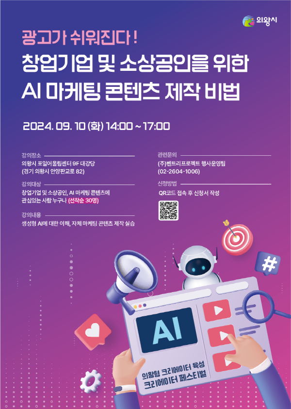 ÇÁ·Î±×·¥ ½ÅûÀº 9¿ù 9ÀϱîÁö ¼±Âø¼ø 30¸í¿¡ ÇÑÇϸç, Æ÷½ºÅÍÀÇ QRÄڵ带 ÅëÇØ ¿Â¶óÀÎ Á¢¼ö°¡ °¡´ÉÇÏ´Ù. ÀÚ¼¼ÇÑ »çÇ×Àº ±â¾÷ÀÏÀÚ¸®°ú À¯´ÏÄܷεå(031-345-2370)·Î ¹®ÀÇÇÏ¸é µÈ´Ù.