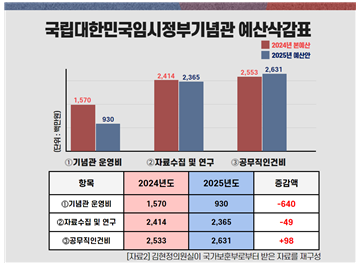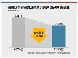 ±èÇöÁ¤ ÀÇ¿ø½ÇÀÌ ±¹°¡º¸Èƺο¡¼ Á¦Ãâ¹ÞÀº¡®2025³âµµ ¿¹»ê¾È ¹× ±â±Ý¿î¿ë°èȹ¾È »ç¾÷¼³¸íÀڷᡯ¿¡ µû¸£¸é, ´ëÇѹα¹ÀÓ½ÃÁ¤ºÎ±â³ä°ü ¿î¿µ ¿¹»êÀº 2024³âµµ 98¾ï1,500¸¸ ¿ø¿¡¼ 2025³âµµ 92¾ï2,400¸¸ ¿øÀ¸·Î 6%¿¡ ´ÞÇÏ´Â 5¾ï9,100¸¸ ¿øÀÌ °¨¾×µÈ °ÍÀ¸·Î È®ÀεƴÙ.