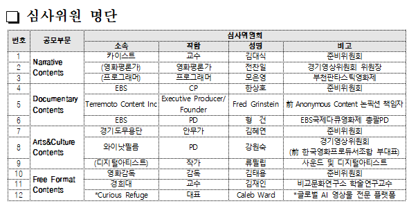 ½É»ç¿¡´Â Á¶Á÷À§¿øÈ¸ÀÎ Ä«À̽ºÆ® ±è´ë½Ä ±³¼ö, ±èÅÂ¿ë ¿µÈ°¨µ¶, °æ±âµµ¹«¿ë´Ü ±èÇý¿¬ ¾È¹«°¡, EBS ÇÑ»óÈ£ CP¸¦ ÇʵηΠCurious RefugeÀÇ CEO Caleb Ward, Terremoto Content IncÀÇ Executive Producer Fred Grinstein µî ±½Á÷ÇÑ ÇØ¿Ü Àü¹®°¡µµ Âü¿©ÇÏ¿© ÀÛǰÀ» ¸é¹ÐÈ÷ ½É»çÇÒ ¿¹Á¤ÀÌ´Ù.