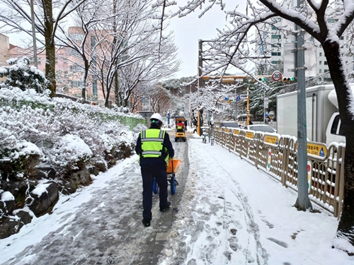 ¿ëÀÎÆ¯·Ê½Ã°¡ Àεµ¿ë Á¦¼³±â¸¦ ÀÌ¿ëÇØ º¸Çà·Î¿¡ ½×ÀÎ ´«À» Ä¡¿ì°í ÀÖ´Ù