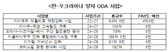 Áö³ÇØ 7¿ù À±¼®¿ ´ëÅë·ÉÀº ¿ìÅ©¶óÀ̳ª¸¦ ¹æ¹®ÇØ Á©·»½ºÅ° ´ëÅë·É°ú Á¤»óȸ´ãÀ» °¡Á³°í, Àç°Ç ºÐ¾ß¿¡¼ ODA¸¦ ÅëÇØ ¿ìÅ©¶óÀ̳ª Àç°Ç»ç¾÷À» Àû±Ø Áö¿øÇÏ°Ú´Ù°í ¾à¼ÓÇÑ ¹Ù ÀÖ´Ù. ÀÌ¿¡ µû¶ó °øÇ×À̳ª öµµ, Àü·Â µî ÀÎÇÁ¶ó ±¸Ãà ¼º°ÝÀÇ ¾çÀÚ»ç¾÷ÀÌ 2024³âµµ¿¡ 5°Ç ½Å±Ô·Î Æí¼ºµÆÀ¸¸ç, ´ÙÀÚÇù·Â»ç¾÷ÀÌ ¾Æ´Ñ ÇÑ-¿ì ¾çÀÚ»ç¾÷À¸·Î »ç¾÷¹ß±¼ºÎÅÍ ½Ç½Ã±îÁö ¿ì¸® Á¤ºÎ°¡ ¿ìÅ©¸®¾Æ³ª Á¤ºÎ¿Í ÇÔ²² ÁøÇàÇÑ´Ù. »ç¾÷¿¡ µû¶ó °¢°¢ 2~4³â ÁøÇàµÇ¸ç ÃѱԸð´Â ¾à 700¾ï(698¾ï 9õ¸¸¿ø)ÀÌ´Ù.