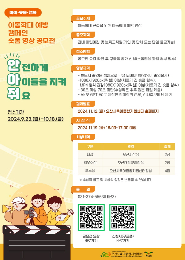 ¿µ»ó ºÐ¾ß '¾È¾ÆÁà!(¾ÈÀüÇÏ°Ô ¾ÆÀ̵éÀ» ÁöÄÑÁà¿ä!) ¼ôÆû ¿µ»ó °ø¸ðÀü'ÀÇ ÀÀ¸ðÀÚ°ÝÀº ¿À»ê½Ã ¾î¸°ÀÌÁý ¹× º¸À°±³Á÷¿øÀ¸·Î ¾Æµ¿ÇÐ´ë ¿¹¹æ ¹× ±ÙÀýÀ» À§ÇÑ Ä·ÆäÀÎÀ» ÁÖÁ¦·Î 30ÃÊ~70ÃÊ ¹Ì¸¸ÀÇ 1,080*1,920 Çȼ¿ ÀÌ»óÀÇ ¿µ»óÀ¸·Î Ãâǰ À帣 Çü½ÄÀÇ Á¦ÇÑÀº ¾ø´Ù.