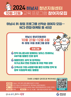 Çϳ²½Ã û³âÁö¿ø¼¾ÅÍ(°æ±âµµ Çϳ²½Ã ¹Ì»ç°º¯´ë·Î 52, Çϳ²½Ã °í¿ëº¹ÁöÇ÷¯½º¼¾ÅÍ 1Ãþ)¿¡¼ ÁøÇàµÇ´Â À̹ø ¡¸Ã롤â¾÷ Áö¿ø ÇÁ·Î±×·¥¡¹Àº 10¿ù 21ÀϺÎÅÍ 12¿ù 6ÀϱîÁö û³â Ãë¾÷ ¿ª·® °È µî 3°³ ºÐ¾ß ÃÑ 40° °úÁ¤À¸·Î ¿î¿µµÈ´Ù.