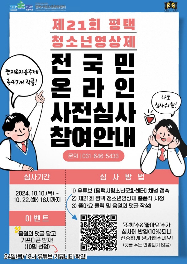 Á¦21ȸ ÆòÅà û¼Ò³â¿µ»óÁ¦ ¿Â¶óÀÎ »çÀü½É»ç´Â ´ë»ó¿¡ Á¦ÇÑ ¾øÀÌ Àü±¹¹Î ´©±¸³ª À¯Æ©ºê [ÆòÅýÃû¼Ò³â¹®È¼¾ÅÍ] ä³ÎÀ» ÅëÇØ Âü¿©ÇÒ ¼ö ÀÖ´Ù. »çÀü½É»ç °ü·Ã ÀÚ¼¼ÇÑ ³»¿ëÀº û¼Ò³â¹®È¼¾ÅÍ(ptycc.kr) °øÁö»çÇ׿¡¼ È®ÀÎÀÌ °¡´ÉÇϰí, ÀüÈ(031-646-5433)¸¦ ÅëÇØ ¾È³»¹ÞÀ» ¼ö ÀÖ´Ù.