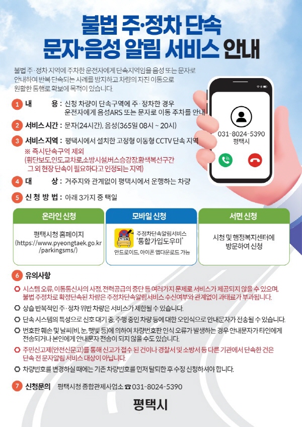 ¼ºñ½º ½ÅûÀº ÆòÅýÃû ´©¸®Áý(https://www.pyeongtaek.go.kr/parkingsms/)¿¡¼ ¿Â¶óÀÎ ½Åû, ¡®ÁÖÁ¤Â÷´Ü¼Ó¾Ë¸²¼ºñ½º ÅëÇÕ°¡ÀÔµµ¿ì¹Ì¡¯ ¸ð¹ÙÀÏ ¾Û ½Åû, ÆòÅýà Á¾ÇÕ°üÁ¦»ç¾÷¼Ò(ÆòÅýÃû º»°ü ÁöÇÏ) ¹× °¡±î¿î À¾¸éµ¿ ÇàÁ¤º¹Áö¼¾ÅÍ¿¡ ¹æ¹®ÇØ ½ÅûÇÏ´Â ¹æ¹ýÀÌ ÀÖÀ¸¸ç, ±âÁ¸ ¹®ÀÚ ¾Ë¸²¼ºñ½º °¡ÀÔÀÚµµ º°µµ ½Åû ½Ã À½¼º ¾Ë¸²¼ºñ½º ÀÌ¿ëÀÌ °¡´ÉÇÏ´Ù.