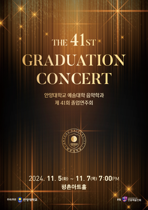 ¾È¾ç´ë À½¾ÇÇаú Á¦41ȸ Á¹¾÷¿¬ÁÖȸ´Â 11¿ù 5ÀϺÎÅÍ 7ÀϱîÁö ¿ÀÈÄ 7½Ã ¾È¾ç½Ã µ¿¾È±¸ ÆòÃÌ¾ÆÆ®È¦¿¡¼ °³ÃֵǸç, ¸¶Áö¸· ³¯ÀÎ 11¿ù 8ÀÏ¿¡´Â °°Àº ½Ã°¢ ¾È¾ç´ëÇб³ ¾Æ¸®È¦¿¡¼ ¿¸°´Ù.