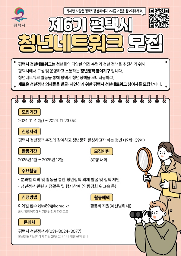 ¸ðÁý ±â°£Àº 11¿ù 4ÀÏ(¿ù)ºÎÅÍ 23ÀÏ(Åä)±îÁöÀÌ¸ç ¸ðÁýÀοøÀº 30¸íÀÌ´Ù. Âü¿© ´ë»óÀº ÆòÅýÿ¡ °ÅÁÖÇϰųª ÆòÅýà û³â¹®È­ Ȱ¼ºÈ­¿¡ Âü¿©ÇϰíÀÚ Çϴ û³â(19~39¼¼)ÀÌ¸é ´©±¸³ª ½Åû °¡´ÉÇÏ´Ù.