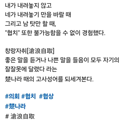 ±×´Â ¡°³»°¡ ³»·Á³õÁö ¾Ê°í ³×°¡ ³»·Á³õ±â¸¸À» ¹Ù¶ö ¶§ ÇùÄ¡´Â ºÒ°¡´ÉÇÏ´Ù¡±¶ó´Â ¸Þ½ÃÁö¿Í ÇÔ²² °í»ç¼º¾î ¡®Ã¢¶ûÀÚÃë(óçÕÈí»ö¢)¡¯¸¦ ÀοëÇÏ¸ç ¾ç´çÀÇ Ã¥ÀÓÀ» µ¹¾Æº¼ Çʿ䰡 ÀÖÀ½À» ¾Ï½ÃÇß´Ù.