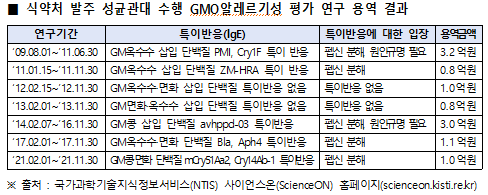 3ÀÏ ±èÇöÁ¤ ±¹È¸ÀÇ¿ø(Á¤¹«À§¿øÈ¸, ÆòÅýú´)¿¡ µû¸£¸é ½ÄǰÀǾàǰ¾ÈÀüó°¡ 10¾ï9,000¸¸¿øÀ» µé¿© 2009³âºÎÅÍ 2021³â±îÁö 7Â÷·Ê¿¡ °ÉÃÄ ¼º±Õ°ü´ëÇб³¿¡ À§Å¹ÇØ ½Å±Ô GMOÀÇ ¾Ë·¹¸£±â¼º Æò°¡ ¿¬±¸¿ë¿ªÀ» ÁøÇàÇÑ °á°ú, 5°ÇÀÇ ¿¬±¸¿ë¿ª¿¡¼ GMO Äᡤ¿Á¼ö¼ö¡¤¸éÈ ½ÅÁ¾ ´Ü¹éÁú 8Á¾ÀÌ ¾Ë·¹¸£±â ƯÀ̹ÝÀÀ(lgE)À» ºÒ·¯ ÀÏÀ¸Ä×´Ù.