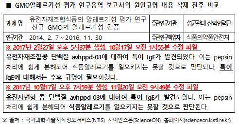 ±¹³» Àǰú´ëÇÐ ¿¬±¸ÁøÀÌ GMO ½ÅÁ¾ ´Ü¹éÁú¿¡ µû¸¥ ¾Ë·¹¸£±â ƯÀÌ ¹ÝÀÀ¿¡ ´ëÇÑ ±Ô¸íÀÌ ÇÊ¿äÇÏ´Ù´Â ¿¬±¸¿ë¿ª º¸°í¼¸¦ Á¤ºÎ ´ç±¹¿¡ °Åµì Á¦ÃâÇϰí, ±¹È¸µµ Áø»ó ÆÄ¾ÇÀ» Ã˱¸ÇßÁö¸¸ ¿ÀÈ÷·Á ¿øÀÎ ±Ô¸í¿¡ °üÇÑ ³»¿ëÀÌ »èÁ¦µÈ º¸°í¼°¡ Àç¹èÆ÷µÇ°í ÈÄ¼Ó ¿¬±¸µµ ÀÌ·ïÁöÁö ¾Ê°í ÀÖ´Ù.