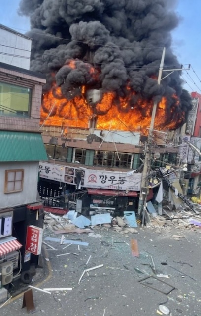 ¼Ò¹æ°ü°èÀÚ¿¡ ÀÇÇÏ¸é ºÒÀÌ ³­ °Ç¹°Àº 1Ãþ¿¡´Â ½Ä´ç, 2Ãþ¿¡´Â ¹Ì¿ë½Ç, 3Ãþ¿¡´Â PC¹æÀÌ À§Ä¡ÇØ ÀÖ¾ú´Âµ¥ 3Ãþ PC¹æÀ» ÀμöÇϱâ À§ÇØ ¹æ¹®Çß´ø »ç¶÷µéÀÌ °¡½º ³¿»õ¸¦ ´À³¢°í â¹®À» ¿­¾î ȯ±âÇÏ´Â µµÁß ´ã¹è¸¦ ÇÇ¿ì±â À§ÇØ ¶óÀÌÅ͸¦ ÄÑÀÚ Æø¹ßÀÌ ¹ß»ýÇÑ °ÍÀ¸·Î ÃßÁ¤µÈ´Ù°í ÀüÇß´Ù.