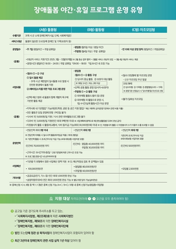 ¡®¾îµð³ª µ¹º½¡¯Àº µ¹º½ ¿å±¸°¡ ÀÖÀ½¿¡µµ ±×°£ ÃæºÐÇÑ Áö¿øÀ» ¹ÞÁö ¸øÇÑ Àå¾ÖÀεéÀ» À§ÇÑ »ç¾÷À¸·Î ¡ãÀå¾Öµ¹º½ ¾ß°£¡¤ÈÞÀÏ ÇÁ·Î±×·¥ ¿î¿µ ¡ãÃÖÁßÁõ ¹ß´ÞÀå¾ÖÀÎ ¸ÂÃãµ¹º½ ¡ãÃÖÁßÁõ ¹ß´ÞÀå¾ÖÀÎ °¡Á·µ¹º½ µîÀ¸·Î ±¸¼ºµÆ´Ù.
