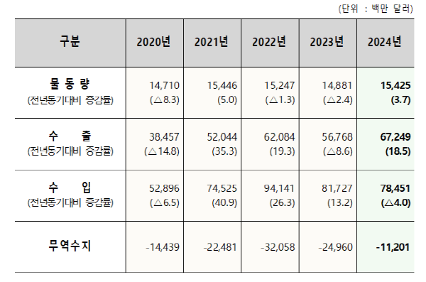 2024³â ¹«¿ª¼öÁö´Â ¹ÝµµÃ¼, ¼®À¯Á¦Ç° µî ÁÖ¿ä ǰ¸ñÀÇ ¼öÃâ Áõ°¡·Î ÃÖ´ë ¼öÃâ ½ÇÀûÀ» ´Þ¼ºÇÔ°ú µ¿½Ã¿¡ ¼öÀÔÀÌ °¨¼ÒÇϸç ÃÖ±Ù 5³â°£ °¡Àå °³¼±µÈ 112¾ï ´Þ·¯ ÀûÀÚ¸¦ ±â·ÏÇß´Ù.